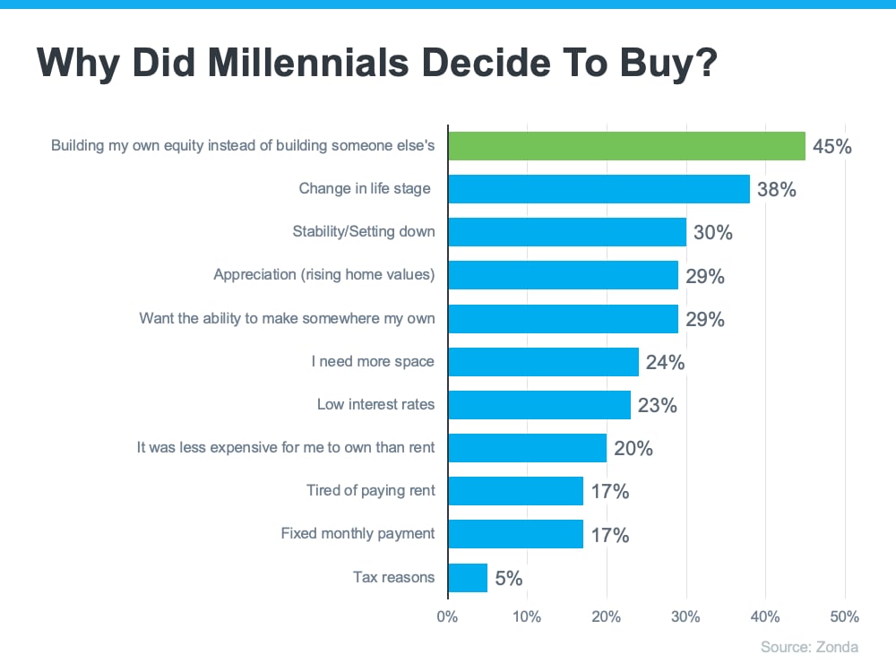 This graph shows why millennials are buying homes according to Zonda’s 6^th annual millennial survey. The top reasons include building equity, a change in life stage, wanting stability, rising home values, and wanting to make somewhere truly their own. Here’s a look at each in more detail.