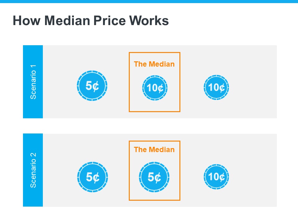 To drive this point home, here’s a simple explanation of median value (see visual below). Let’s say you have three coins in your pocket, and you decide to line them up according to their value from low to high. If you have one nickel and two dimes, the median value (the middle one) is 10 cents. If you have two nickels and one dime, the median value is now five cents.